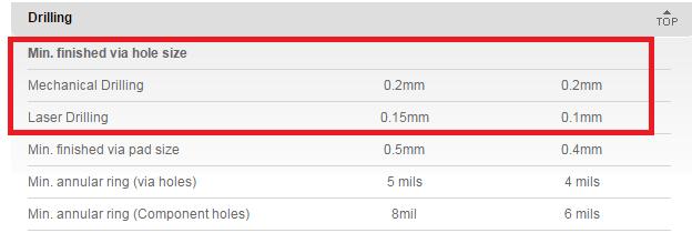 Most manufacturers accept finish hole sizes from 0.3mm and higher as standard. Some manufacturers charge extra for 0.25mm finish holes (standard for QualiEco Circuits). QualiEco can also accept 0.2mm finish holes by paying extra. In few exceptional cases, 0.15mm finish hole size can also be acceptable using mechanical drilling process. Any less than 0.15mm can only be possible by laser drilling process, which is quite expensive.